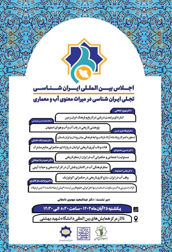 نشست تجلی ایرانشناسی در میراث معنوی آب و معماری در تاریخ 25 آبان در سالن علامه طباطبایی مرکز همایشهای بینالمللی دانشگاه برگزار شد. اجلاس بینالمللی ایرانشناسی به همت سازمان فرهنگ و ارتباطات اسلامی و بنیاد ایرانشناسی و با میزبانی دانشگاههای شهید بهشتی، تهران، علامه طباطبایی، فردوسی مشهد و شیراز طی چهار روز از 24 الی 27 آبان در تهران و شیراز برگزار شد. در نشست دانشگاه شهید بهشتی پژوهشگرانی از هندوستان، عراق، ایتالیا، یونان، گرجستان، جمهوری آذربایجان و قزاقستان حضور داشتند.
