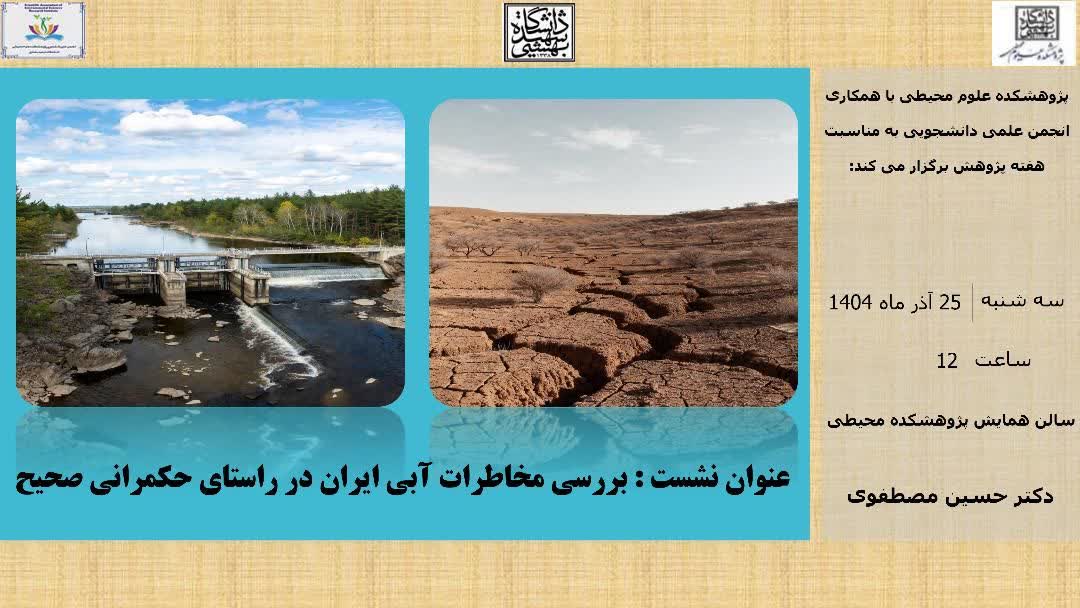 به مناسبت هفته پژوهش، در روز سه شنبه 25 آذر ماه سخنرانی با عنوان "بررسی مخاطرات آبی ایران در راستای حکمرانی صحیح" توسط آقای دکتر حسین مصطفوی انجام شد. در این جلسه که با حضور جمعی از دانشجویان و اعضای هیات علمی پژوهشکده علوم محیطی برگزار شد، آقای دکتر مصطفوی به بیان علل ناترازی های آبی در کشور پرداختند و با ارائه مثال های موفقی از مدیریت منابع آب در سایر کشورها به ویژه اتریش، لزوم مدیریت صحیح منابع آب را در حفاظت از اکوسیستم های آبی دانستند. ایشان با ذکر مثال هایی از عدم مدیریت مناسب منابع آب در کشور، بر لزوم توجه به قابلیت های سرزمینی در بارگزاری کاربری های گوناگون در مناطق تاکید کردند. در پایان پرسش و پاسخ میان شرکت کنندگان و سخنران محترم انجام شد.